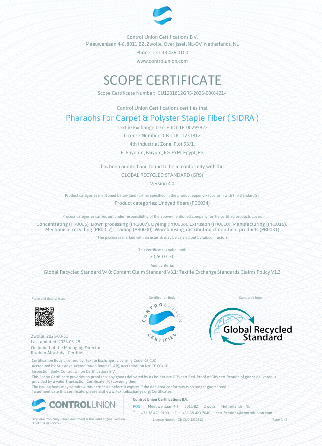 Our commitment to quality is reflected in rigorous testing throughout the production process, guaranteeing consistency in denier, length, and color. This attention to detail enhances both the aesthetic appeal and functional performance of our fibers across a wide range of applications. With decades of experience, we have perfected our manufacturing processes to deliver reliable, sustainable products that exceed customer expectations—making Pharaohs for Polyester Staple Fiber the trusted choice for businesses worldwide.